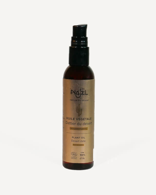Ökendadelolja utvunnen genom en unik kallpressning av fröna från dadelpalmen (iboraghan ou aboghar) och är väldigt mjukgörande. Mjukgör och reparerar torr och skadad hud. Oljan, som har en väldigt torr känsla, passar perfekt för kombinerad hud och skyddar huden utan att göra den för oljig. Ökendadelolja passar också som hårvård, reparerar och återger lyster till livlöst och skadat hår.