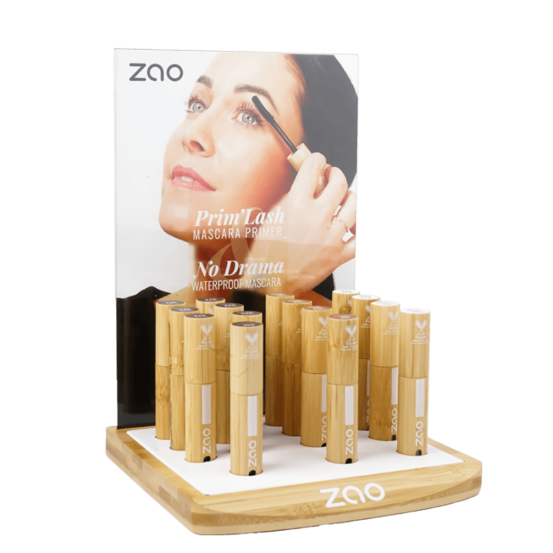 Display för att visa upp nya kollektionen med vår vattenfasta mascara No Drama och Primern Prim’Lash från ZAO Makeup